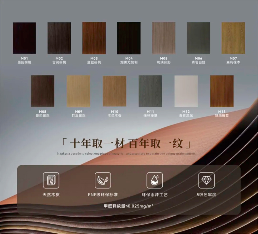 环保水漆天然木皮甄选天然原木基材,创新应用5级色牢度环保水漆,实现零醛零苯添加,结合固色及防黄变等底层处理,锁住木皮缤纷花色,赋予家居空间自然气息,满足中高端消费群体对环保健康与品质生活的双重追求。