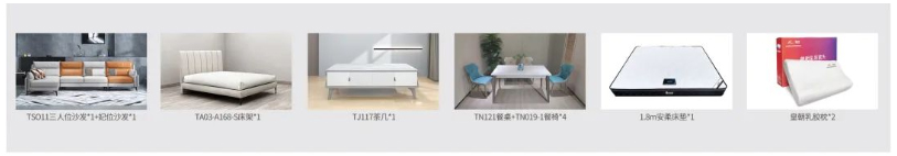 皇朝乳胶枕*2+TSO11三人位沙发*1+TS011妃位沙发*1+TJ117茶几+TN121餐桌+TR019(TR019-1)餐椅*4+TA03-A168-S床架*1+1.8米安柔床垫*1